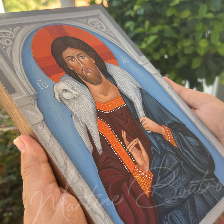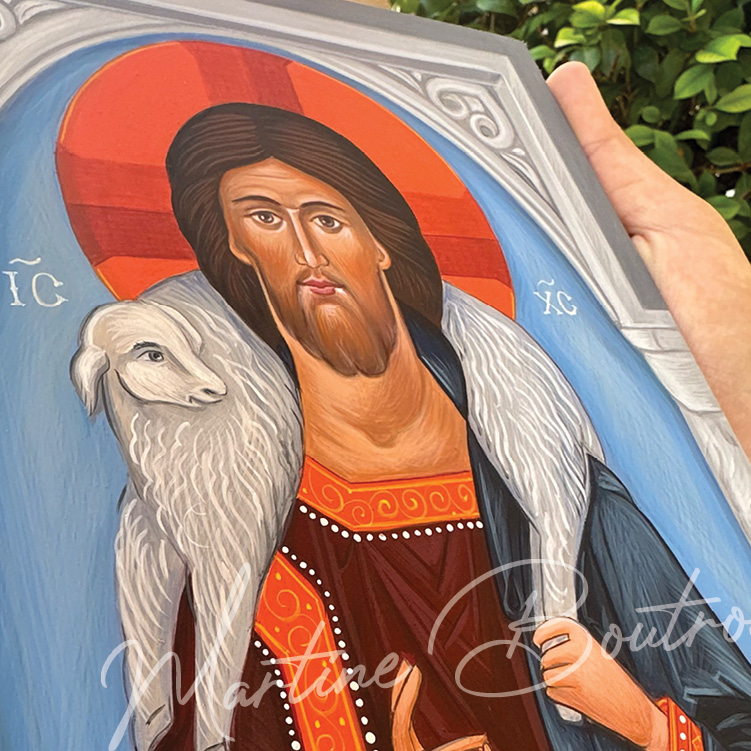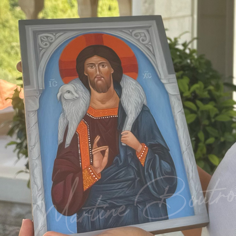تُصوِّر الأيقونة المسيح الراعي الصالح، وهي صورة ذات مغزى عميق في التقليد المسيحي. يظهر شكل يسوع في وضع نصفي، وهو يحمل خروفًا على كتفيه، في إشارة بصرية مباشرة إلى دوره كحامٍ ومخلِّص لقطيعه. هالة رأسه مزينة بصليب، وهو عنصر تقليدي في الأيقونات المسيحية، والحرفان اليونانيان IC و XC يمثلان Iēsous Christos، أي يسوع المسيح.