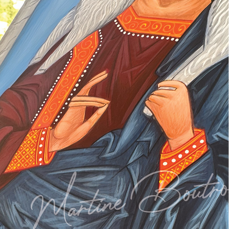 The icon’s composition is rich in symbolism. The figure of Christ is set against a vibrant red and orange mandorla, a symbol of divine light and glory, which is itself framed by an arch. This arch is a traditional symbol of the celestial heavens and the triumph over death, representing Christ’s resurrection. His vestments, in deep red, blue, and gold, signify his dual nature: the red and gold of royalty and divine majesty, and the blue of his humanity and earthly life.