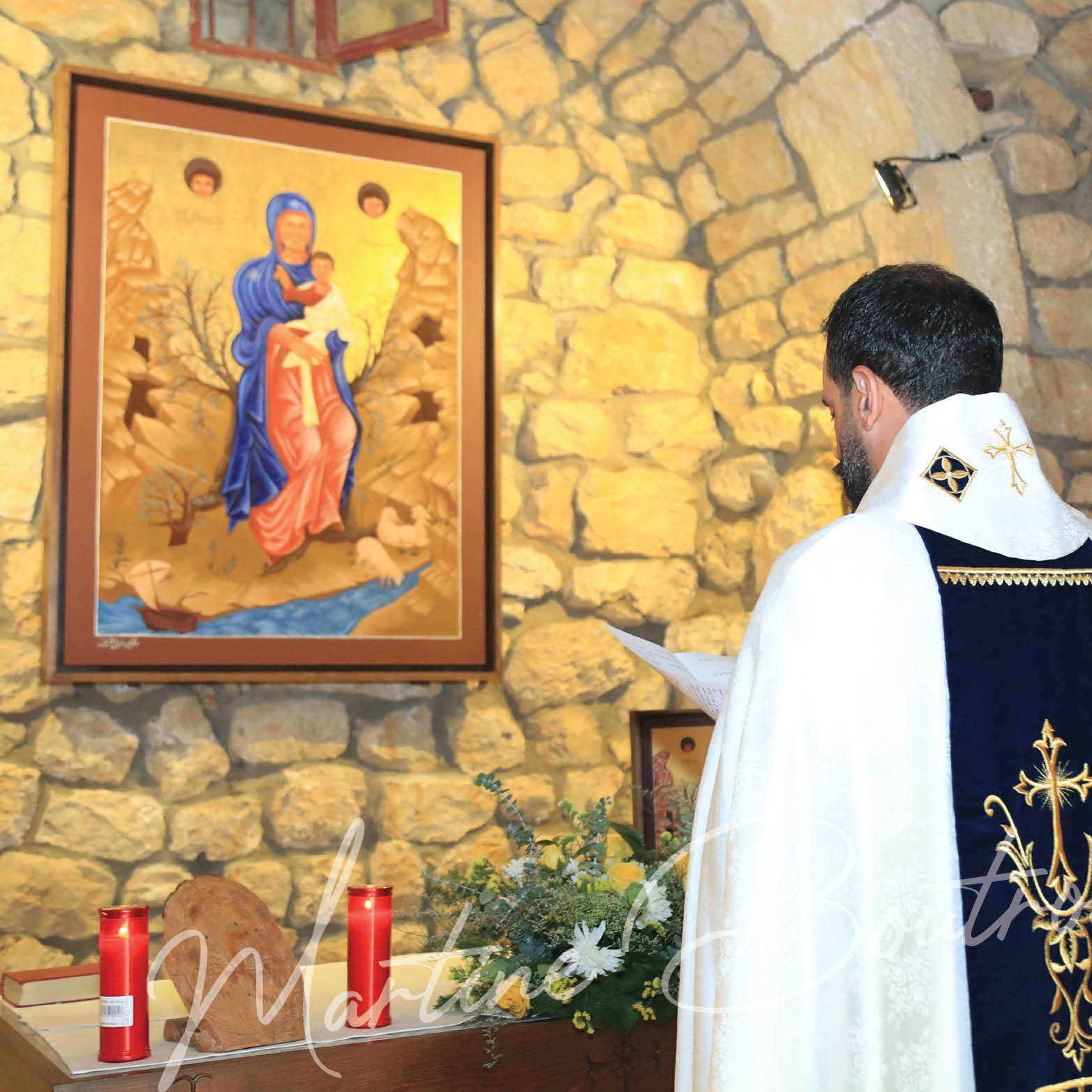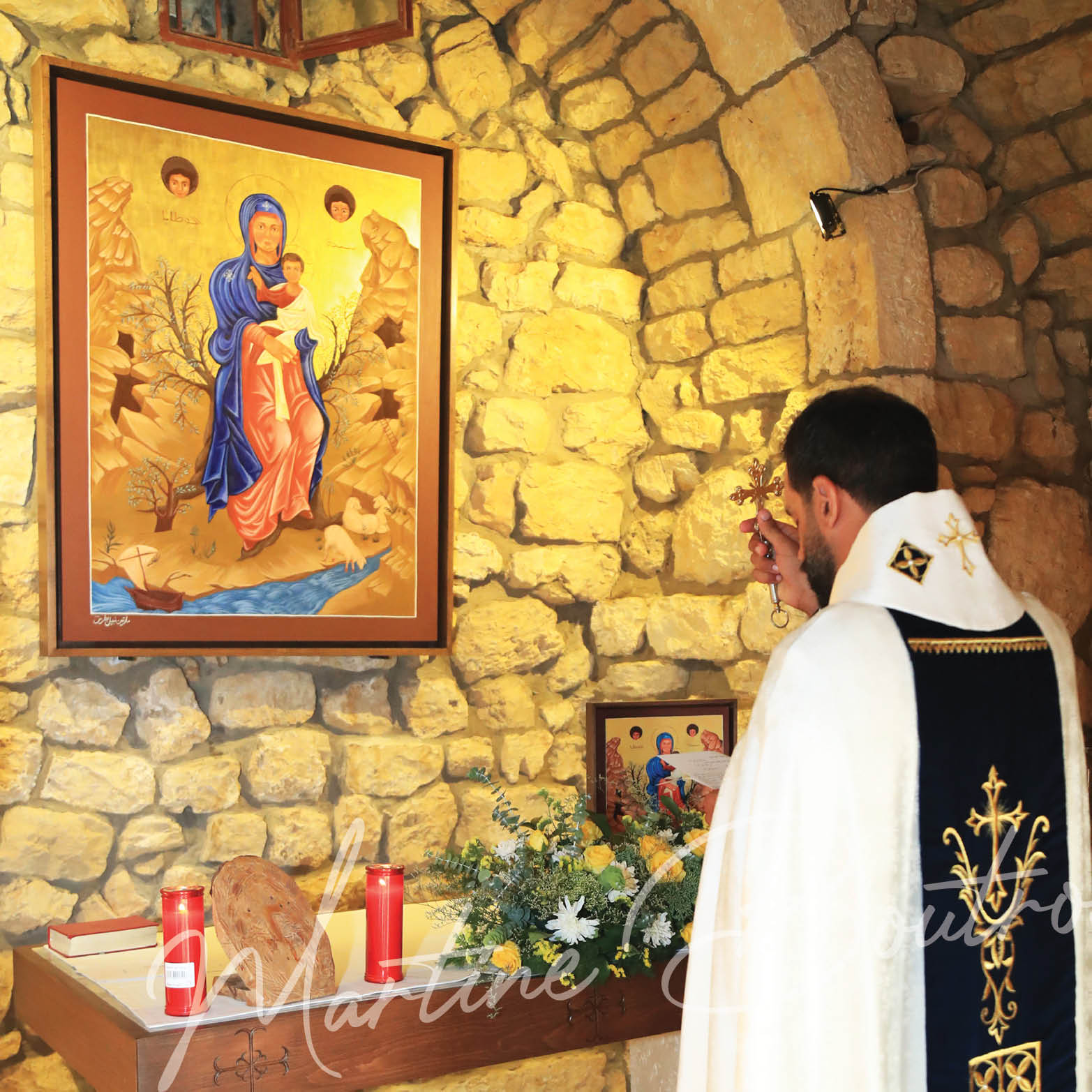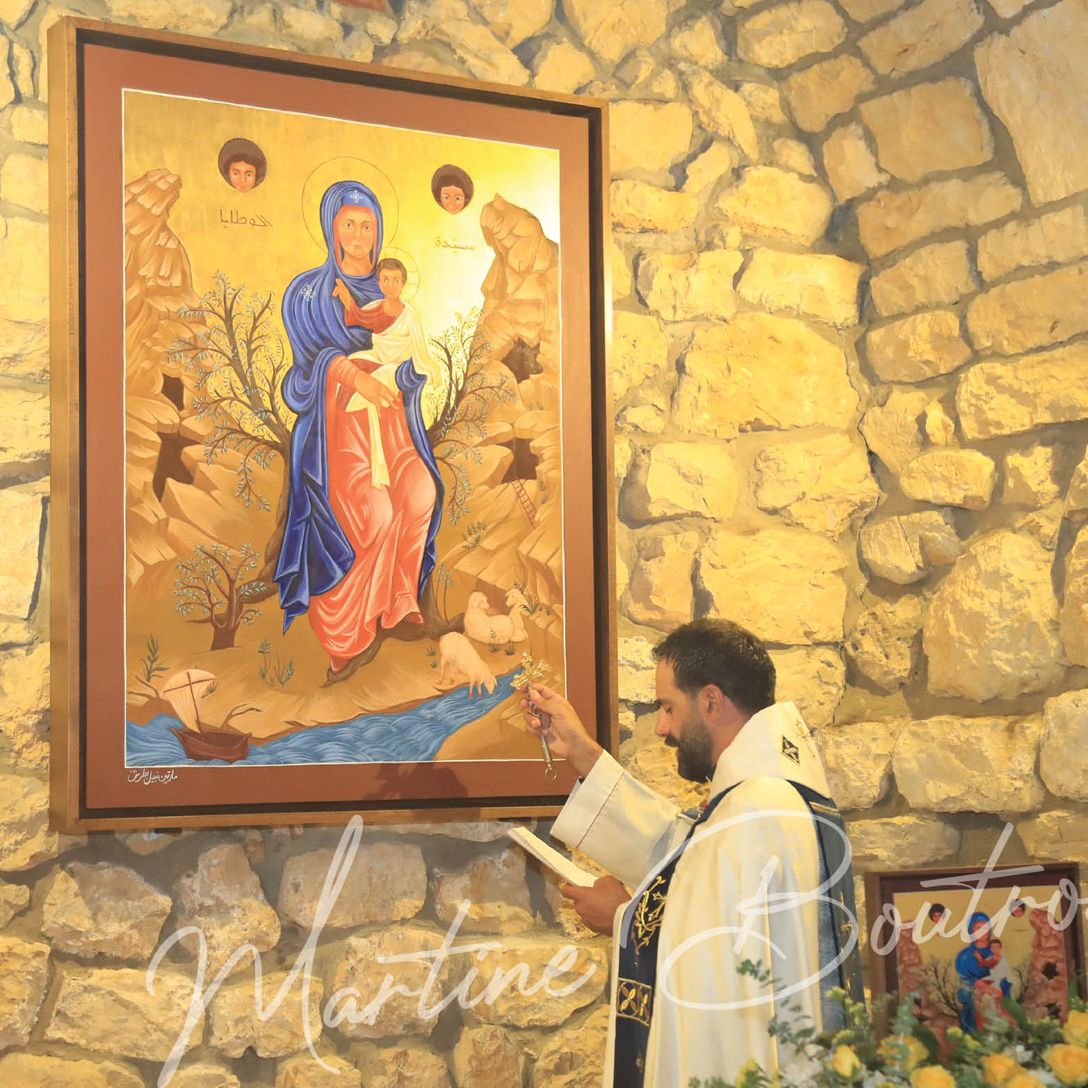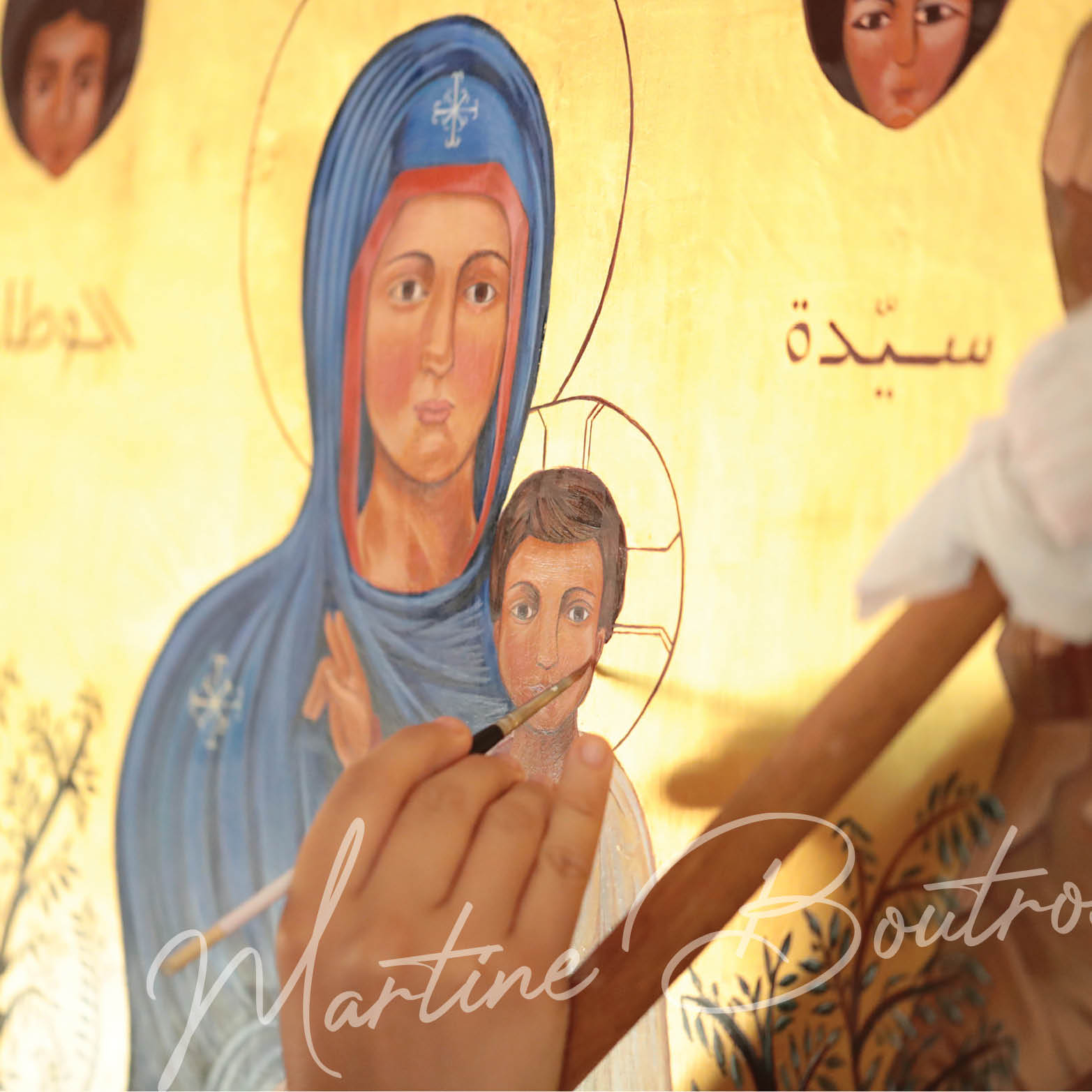 We see the Child Jesus on His mother Mary’s left arm, as the Maronite liturgy says: “And her head is supported by the right hand of the Son, the living, giving Lord.”
