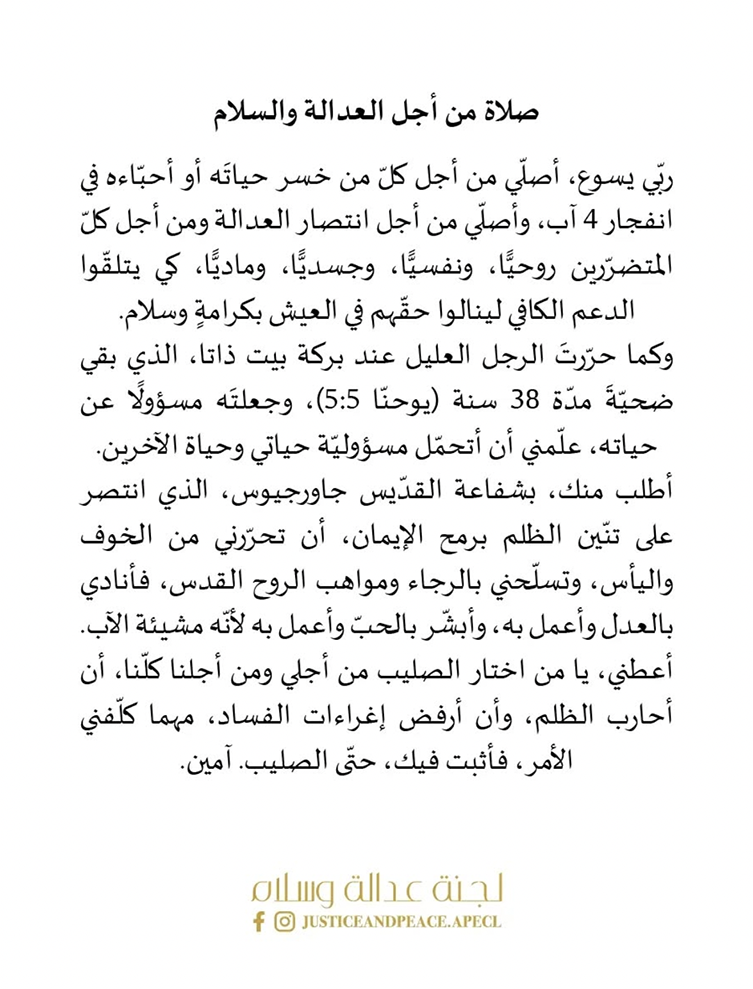 Lord Jesus, I pray for all who lost their lives or loved ones in the August 4th explosion. I pray for the triumph of justice and for all who are affected spiritually, psychologically, physically, and materially, that they may receive sufficient support to obtain their right to live with dignity and peace. And just as You healed the invalid at the Pool of Bethesda, who was a victim for 38 years (John 5:5), and made him responsible for his life, teach me to bear responsibility for my life and the lives of others. I ask You, through the intercession of St. George, who triumphed over the dragon of injustice with the spear of faith, to free me from fear and despair. Arm me with hope and the gifts of the Holy Spirit, so I may advocate for and act with justice, and preach and act with love, for it is the will of the Father. Grant me, O You who chose the cross for my sake and for all of us, to fight injustice and reject the temptations of corruption, no matter the cost, so that I may remain steadfast in You, even to the cross, Amen.