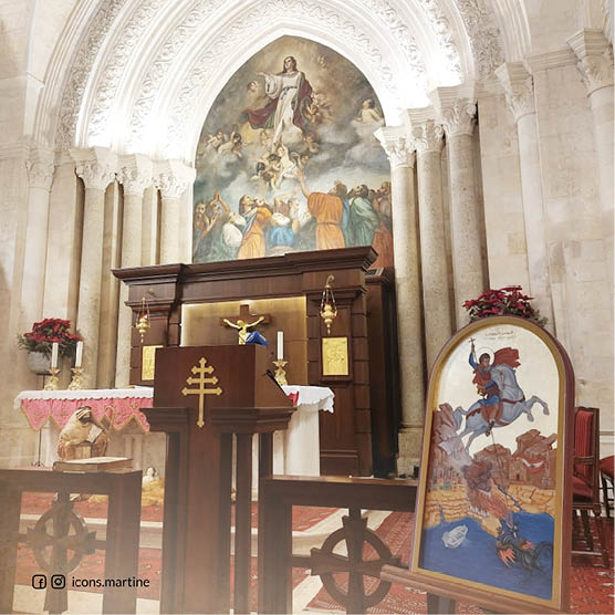 The lower part of the icon depicts the sea of Beirut, a biblical symbol of death and the unknown. In this sea, a small boat—representing humanity—journeys toward salvation, filled with hope in the divine presence, even when it seems to be asleep. Here, a menacing dragon, a symbol of evil, breathes fire, seeking to destroy the city. The icon vividly portrays Beirut’s history of destruction, from natural disasters to wars, with seven layers representing the city’s many ages of suffering.